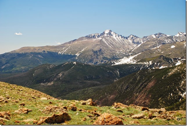 This area was hit hard by the pine beetle – many of the trees are bare and dead – so sad. The cut in the mountain is the Trail Ridge Road: