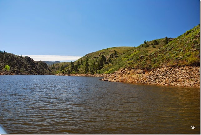 Last year this reservoir was down 85 feet. Right now it is filling at the rate of 1-2 feet and day and they are hoping that it reaches full capacity. Right now, the deepest area is 450 feet and much shallower in the tributaries – as you can see from these trees.